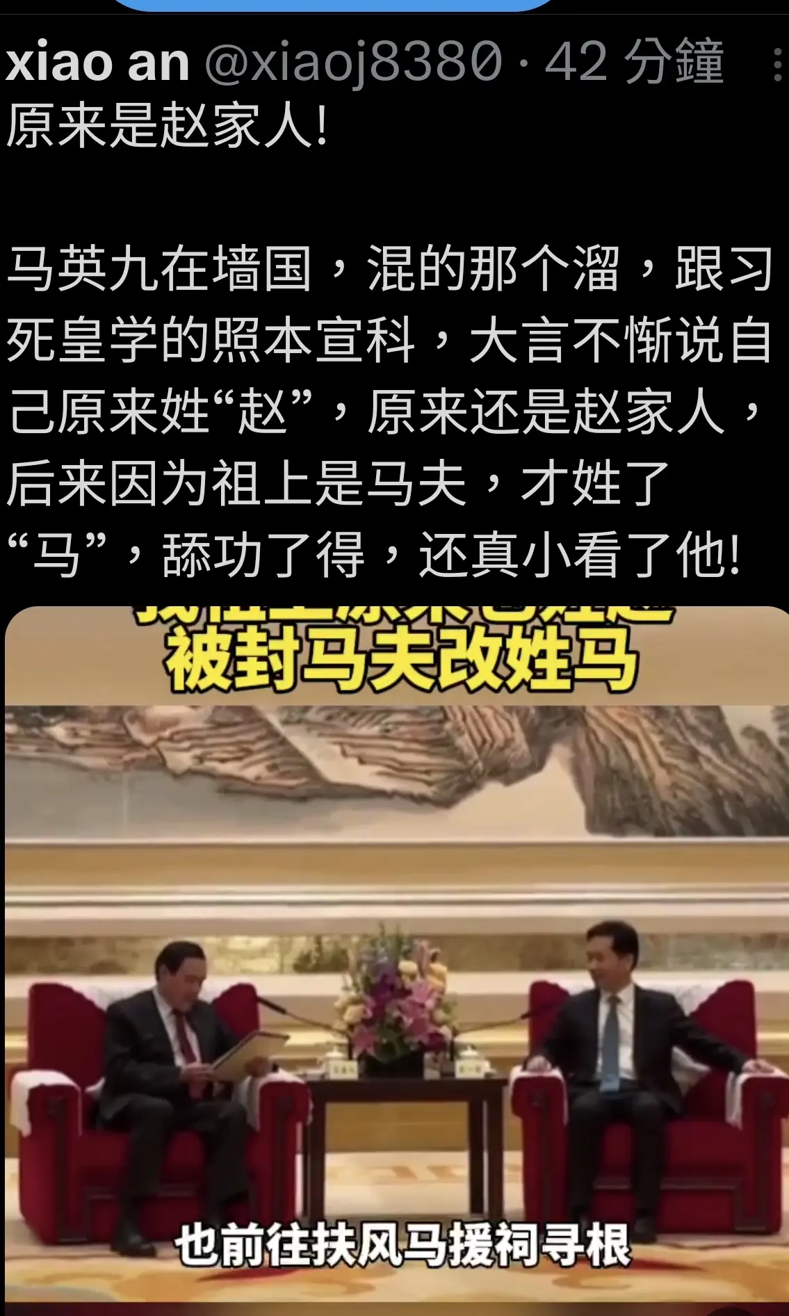 馬英九的主上 原來是姓趙 因為當過馬夫,所以才改姓馬 難怪這樣會 拍馬..... https://yt3.ggpht.com/A-1kfKO_UY3en...=s1893-rw-nd-v1 這種話都說的出來 以後都要改叫馬伕先生 還是要叫趙........ 為了名、為了利 祖先都可以改 真的可以在歷史留名了 |