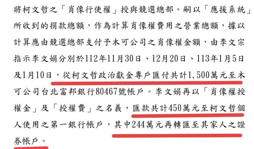 什麼叫「合法申報的政治獻金都可以是貪污?」來,假老二示範給你看 :laugh: 柯文哲侵占民眾黨政治獻金600萬元部分: 柯文哲明知於其111年間仍擔任臺北市市長,並非競選期間,不得以自身名義收受政治獻金,如有個人、政黨、人民團體及營利事業欲捐贈政治獻金,依政治獻金法第5條之規定,僅得以捐贈政治獻金至柯文哲擔任黨主席之民眾黨政治獻金專戶,且亦明知捐贈與民眾黨之政治獻金應作為民眾黨參與政治相關活動使用,所收受之政治獻金,應於收受後15日內存入民眾黨政治獻金專戶,並向監察院申報,竟意圖為自己不法之所有,基於公益侵占之犯意,接續侵占周俊吉配偶周王美文捐贈與民眾黨之現金200萬元、謝國樑之母林曼麗捐贈與民眾黨之現金200萬元、林命群捐贈與民眾黨之現金200萬元,嗣自收款後迄今仍未將之存入民眾黨政治獻金專戶,亦未向監察院申報。 (二)柯文哲、李文宗、李文娟共同犯公益侵占部分: 1. 以肖像授權收取授權金之方式,侵占柯文哲政治獻金專戶1,500萬元: 柯文哲、李文宗、李文娟知悉競選團隊利用候選人自身肖像結合政見作為競選宣傳並募集政治獻金之用,且政治獻金不得為營利行為,由柯文哲先於111年11月1日與木可公司簽立「肖像權暨著作財產授權同意書」約定將柯文哲之肖像權(包含照片、聲音及動態像)全權獨家授權給木可公司,柯文哲宣布參選總統後,指派李文宗及李文娟分別擔任競選總部之財務長、支出帳務審核人員,綜理柯文哲政治獻金專戶之收支事宜;再由柯文哲實際掌控之木可公司與柯文哲競選總部簽立「授權委託作業管理合約書」,約定由木可公司將柯文哲之「肖像行使權」授與競選總部。嗣以「應援系統」所收到的捐款總額,作為計算肖像權費用之營業總額,據以計算應由競選總部支付予木可公司之肖像權金額,由李文宗指示李文娟分別於112年11月30日、12月20日、113年1月5日及1月10日,從柯文哲政治獻金專戶匯付共計1,500萬元至木可公司台北富邦銀行80467號帳戶。李文娟再以「肖像權授權金」及「授權費」之名義,匯款共計450萬元至柯文哲個人使用之第一銀行帳戶,其中244萬元再轉匯至其家人之證券帳戶。 2. 以支付木可公司員工薪水名義之方式,共同侵占柯文哲政治獻金專戶賸餘款共124萬1,036元 柯文哲、李文宗、李文娟均明知擬參選人收受之政治獻金賸餘款之法定支出項目限制,而木可公司係營利事業法人,並非政黨、公益慈善團體,亦非參加公職人員選舉之目的,故木可公司支付予李文宗、李文娟、李婉萱、余孟苓、顧凌妃、謝泊泓及練鴻慶等7人之薪資,與政治獻金法第23條第1項規定不符,自不得以柯文哲政治獻金專戶支付。仍由柯文哲指示李文宗、李文娟使用柯文哲政治獻金專戶賸餘款,接續於113年4月9日起匯款共計124萬1,036元至木可公司台北富邦銀行80467號帳戶,作為木可公司員工李文宗等7人薪資支付之用。柯文哲、李文宗、李文娟以上開方式侵占政治獻金賸餘款124萬1,036元。 3. 以木可公司侵占KP小物募款所得之柯文哲政治獻金共4,133萬5,588元 柯文哲、李文宗、李文娟明知柯文哲臉書、柯文哲IG、民眾黨官方網站、木可公司網路商店所刊登之關於第三波募款小物之競選宣傳文章,以及相關宣傳網頁上,均明載「柯文哲第三波募款小物」、「捐款」、「募款」、「斗內」、「選總統募款」、「選舉終究需要很多錢」、「國政討論、政策共論」、「選舉還是需要不少花費」等文字。該等募款小物之價格均為成本之數倍,為不相當對價之給付,顯係對柯文哲從事政治、籌募競選活動所提供之資金,故該等募款小物,性質屬於為謀取民眾支持柯文哲競選總統所捐贈之政治獻金,故應存入柯文哲政治獻金專戶,竟為將募款小物,募款所得政治獻金侵占入己,以木可公司進行販售而收取募款所得,共同意圖為自己不法之所有,基於公益侵占之犯意聯絡,於112年6月19日至113年1月19日間,接續將原應屬於政治獻金之收入4,133萬5,588元,均予以侵占入己,而未存入柯文哲政治獻金專戶。 4. 以木可公司侵占KP SHOW演唱會盈餘77萬166元 柯文哲、李文宗、李文娟承上籌募柯文哲競選活動之選舉資金之意,且為宣傳柯文哲政治理念、政策,決定舉辦「KP SHOW募款演唱會」,先透過柯文哲臉書、柯文哲IG刊登之募款演唱會之競選宣傳文章,內容包含「募款」、「台北市長」、「參選中華民國總統」等柯文哲從事政治、籌募競選活動資金之內容,且募款演唱會1張門票價格為8,800元,相較於柯文哲之演唱內容為不相當對價之給付。購買募款演唱會之民眾,性質屬為支持柯文哲政治理念、競選總統所捐贈之政治獻金,而應存入柯文哲總統擬參選人政治獻金專戶,依法規目的而為使用。然由柯文哲先於112年7月17日指示李文宗、李文娟,以木可公司名義與尼奧創意行銷有限公司簽立「KP SHOW演唱會活動執行企劃合約書」,由尼奧公司於112年7月29日為柯文哲舉行「KP SHOW募款演唱會」,並取得門票、公播授權費等收入共計531萬400元,扣除相關支出454萬204元後,由尼奧公司於112年9月7日,將募款演唱會所得收益77萬166元,匯至木可公司台北富邦銀行80467號帳戶。柯文哲、李文宗、李文娟以上開方式,將性質為政治獻金之募款演唱會門票收入,共計77萬166元之款項,均匯入木可公司富邦銀行80467號帳戶內之方式,將該政治獻金侵占入己。 5. 以木可公司侵占採風情資分