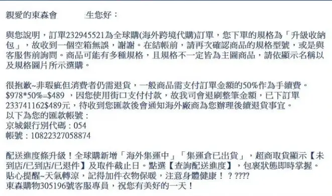 退貨要付50%手續費??