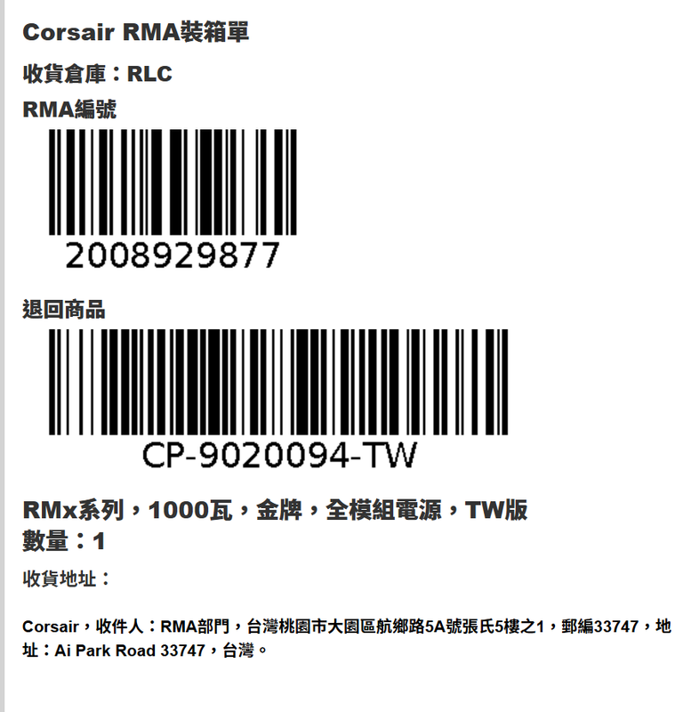 【產品詳細說明】 這顆是 2021/02 購入之舊款出保,官方直接更換最新一批的 RM1000x ATX 3.1 版本。 外盒已更新標示 NVIDIA 50 SERIES READY,支援最新 12V-2x6 介面規範。 本體除了通過 80 PLUS 金牌,更獲得 Cybenetics Platinum (白金) 與 A 級噪音 認證,是目前海盜船 1000W 等級中最穩定的批次。 【保固細節】 保固約至 2031 年 2 月。 原始發票遺失,但隨附官方 RMA 裝箱單據。 官方已依序號收件維修,未來出保無慮。 【金額】 $4,500 【交易地點】 板橋車站前7-11 面交 / 賣貨便/交貨便 貨到付款 。 【他團同步】 有 圖1:電源供應器本體全新未拆 圖2:送修時的RMA單號 ![]() 此文章於 2026-04-29 06:52 AM 被 大貓貓 編輯. |