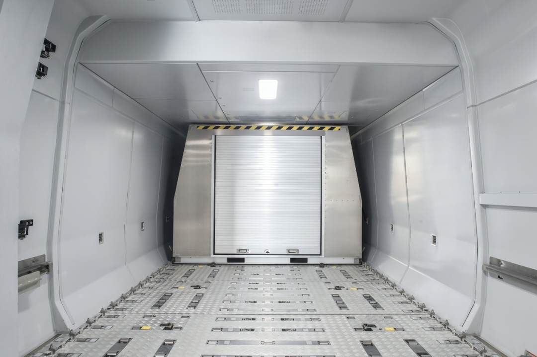 和普通客運動車組相比,這列具有中華鲟骨骼仿生形車頭、銀白紅三色貫通車身的高速貨運動車組,在外觀上有一個顯著的不同——每節車廂側面都有一對2.9米寬、全球最大開度的裝載門,方便貨物裝載。