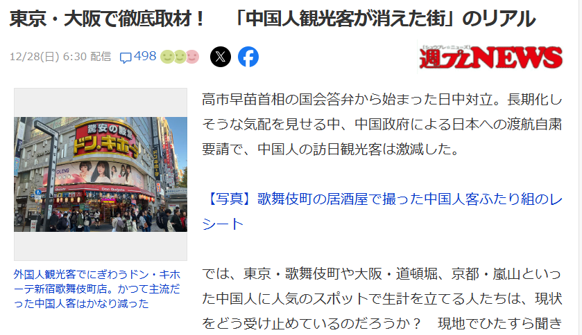 今天刷到一篇說日本媒體報導東京跟大阪明顯感受到中國游客變少了。 大阪觀光局在與多家旅行社溝通後得到的回應幾乎一致: 團體遊和公務、企業視察全部取消,個人遊的取消比例也高達七到八成。 一些標榜中文服務OK的民宿業者表示預訂率直接掉了80%。 行李箱專賣店銷售大受影響,因爲代購大量消失所以買行李箱裝戰利品的也沒了。 神奇的是計程車業受到的衝擊最小,原因是因爲中國游客本來就不喜歡搭正牌計程車, 中國游客消失之後困擾計程車行業許久的白牌車(黑車)也直接從街頭消失了。 ![]()