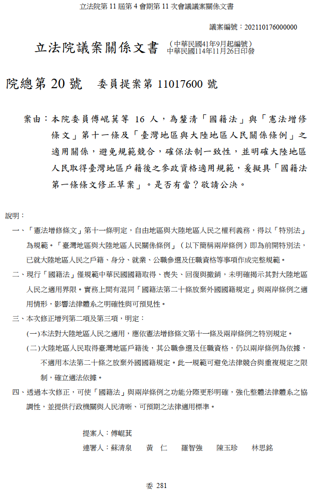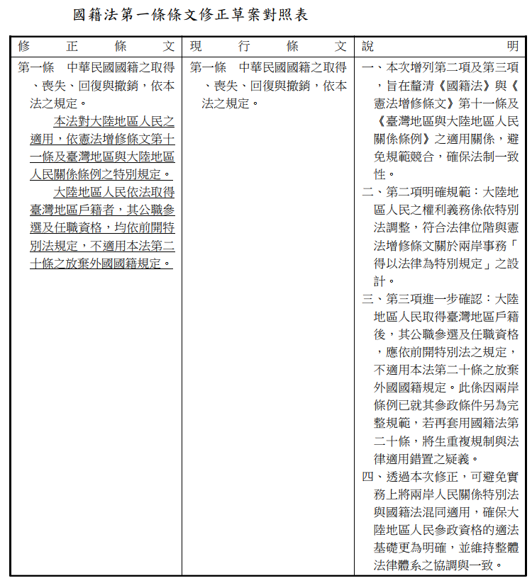 什麼中華人民共和國國籍? 按照「臺灣地區與大陸地區人民關係條例」, 鄧萬華的生父的身分是我國「大陸地區人民」。 我國國籍法是採「屬人主義」,不是「屬地主義」。 所以鄧萬華的生父住哪邊都沒差, 按國籍法,鄧萬華還是屬中華民國國籍。 民進黨自己都知道用國籍法站不住腳, 才會提案修正條文增加「或境外政治實體之公民身分」。 之前的判決擺明就是沒有法條依據。 要修法,怎麼不直接修「臺灣地區與大陸地區人民關係條例」。 https://lis.ly.gov.tw/lygazettec/mt...01_110410_00175 https://law.moj.gov.tw/LawClass/Law...?pcode=Q0010001 引用: